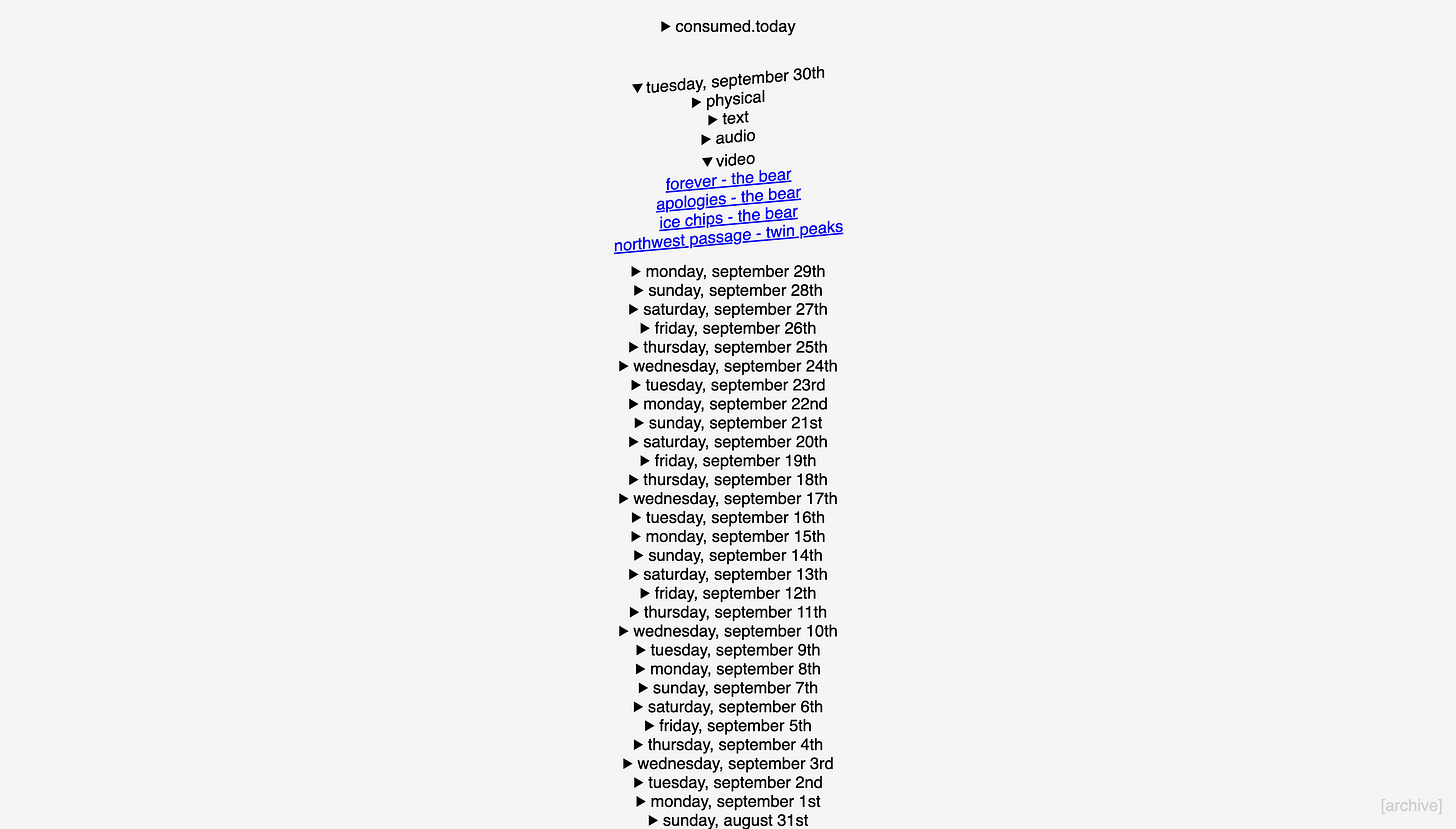 In the spirit of great documentation, try Consumed Today - a project by Shen, who makes these really beautiful websites. This one is a documentation of what they read, hear and see every day. Very fascinating!