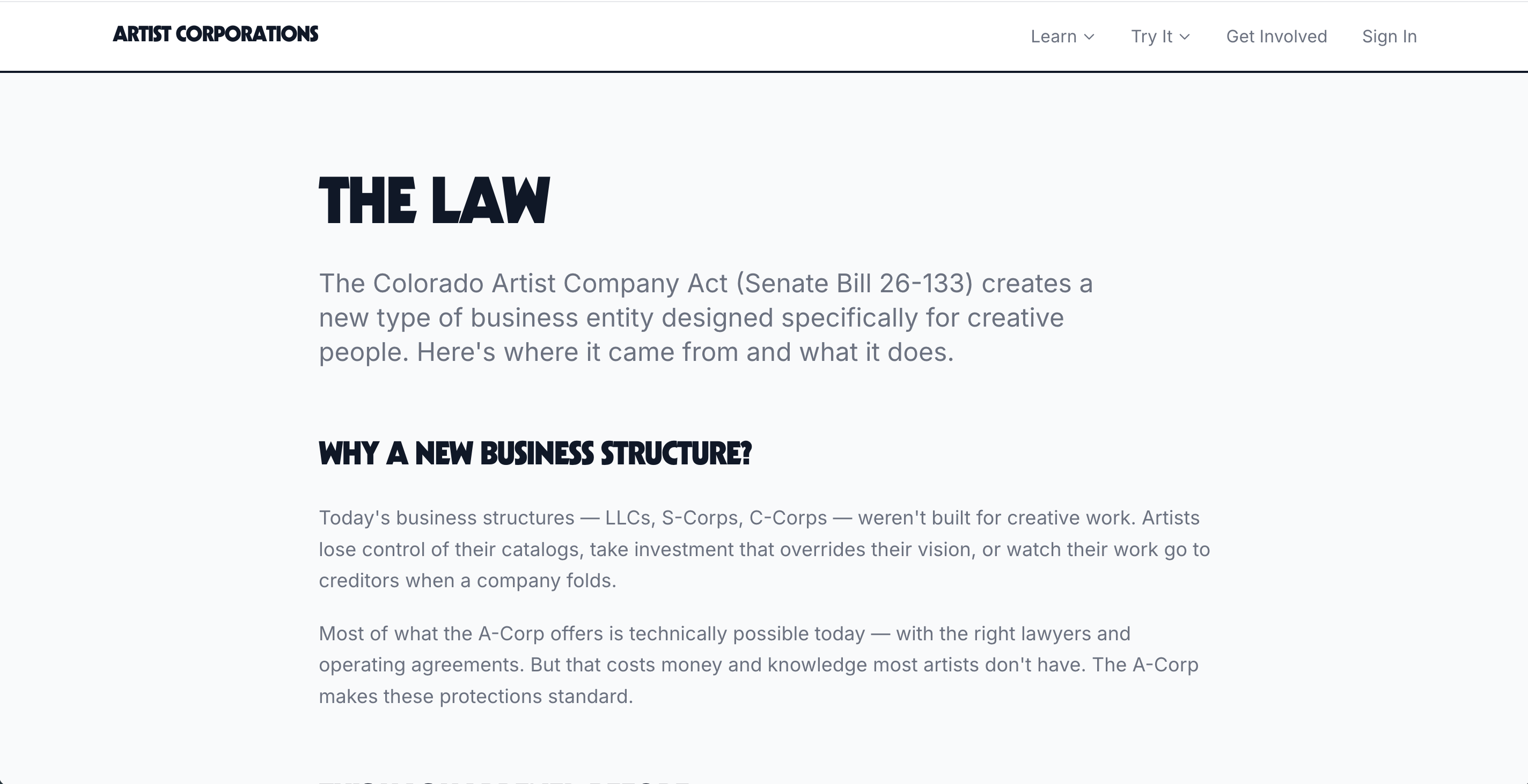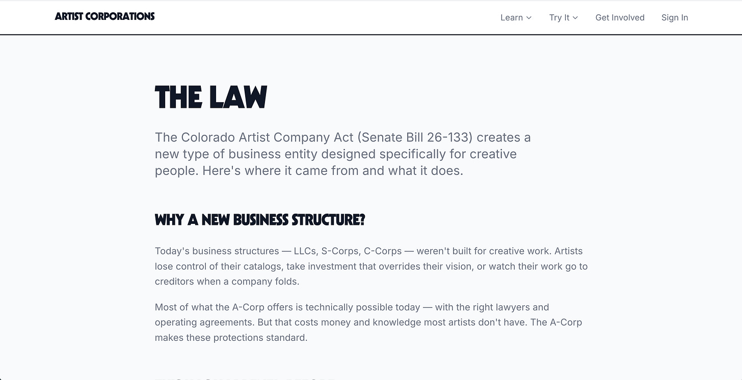 The Artist Corporation is a new type of business entity designed for creative people. Artists keep majority control, intellectual property is protected by law, and the artistic mission comes first. Senate Bill 26-133 would make it real in Colorado — and set the model for every state.